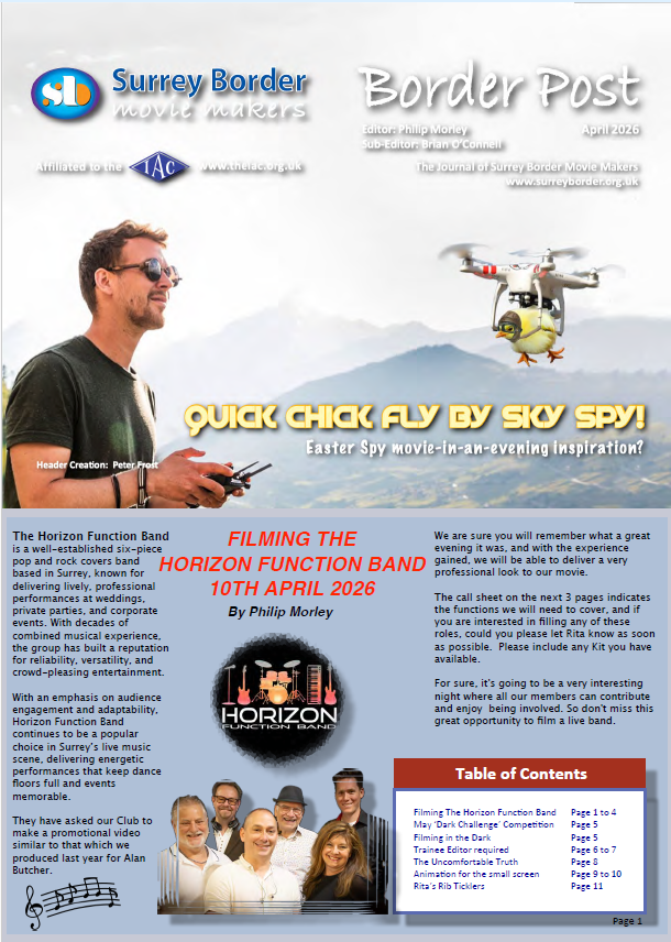 Surrey Border Movie Makers Updates Club News Club Videos clubnight 2026 April Club Night Animation Club News clubnight DAVE SKERTCHLY’S ANNUAL ANIMATION SHOW Ai Club News clubnight The Ai Revolution – Jim Reed Challenges Club News Competitions 2026 Spring Video Challenge Club News Artificial Intelligence Ai Video Making Ai as a Script Writer About SBMM About Us (Mike Sanders Club Chairman) Find out more Club Programme 6th MarchHall MeetingDave Skertchly’sAnimation ‘Show and Tell’Meeting in the Hall on 6th March 8:00pm When we meet We usually meet on the 1st Friday of the month at St Joan’s Centre, 19 Tilford Road, Farnham Surrey, GU9 8DJ – Check our programme for details. Follow Us Facebook-f Youtube Latest Border Post How to find us... GU9 8DJ Contact Us Join our Club